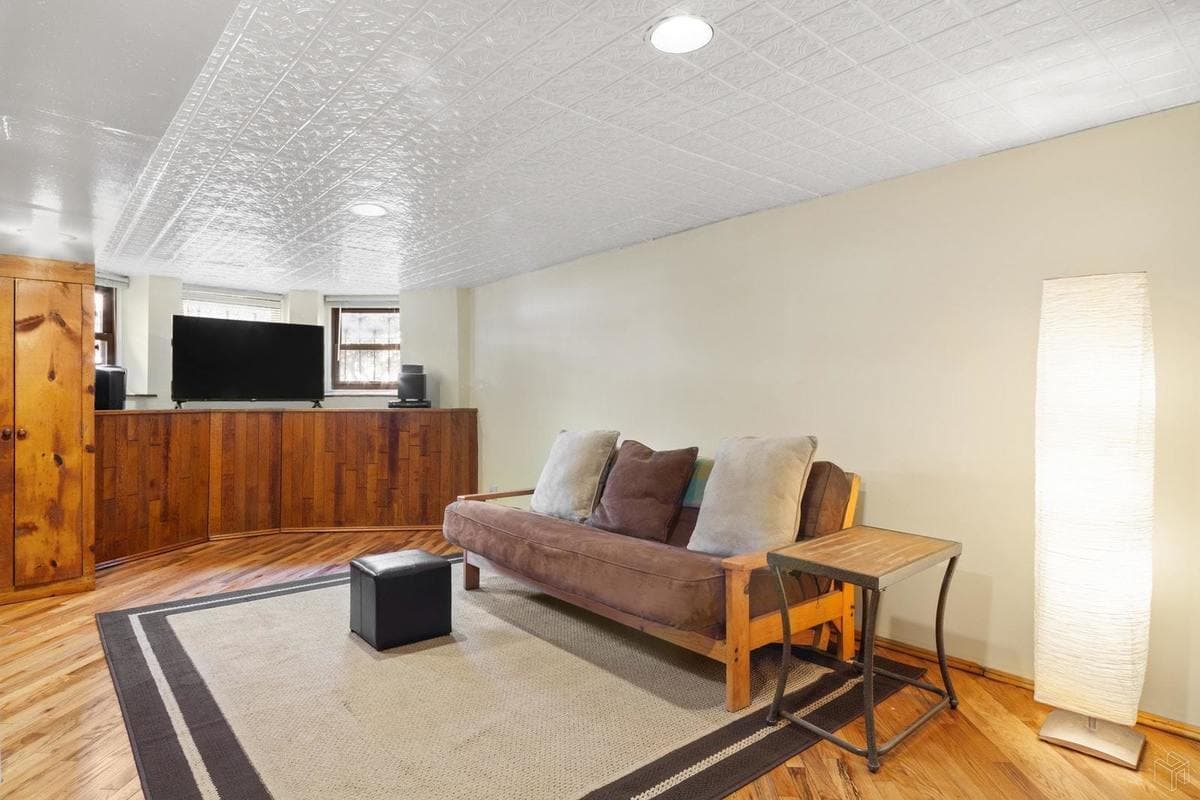 A renovated lower level has hardwood oak floors, tin ceilings, and a washer and dryer.