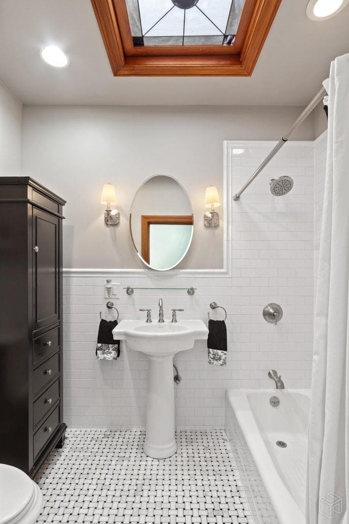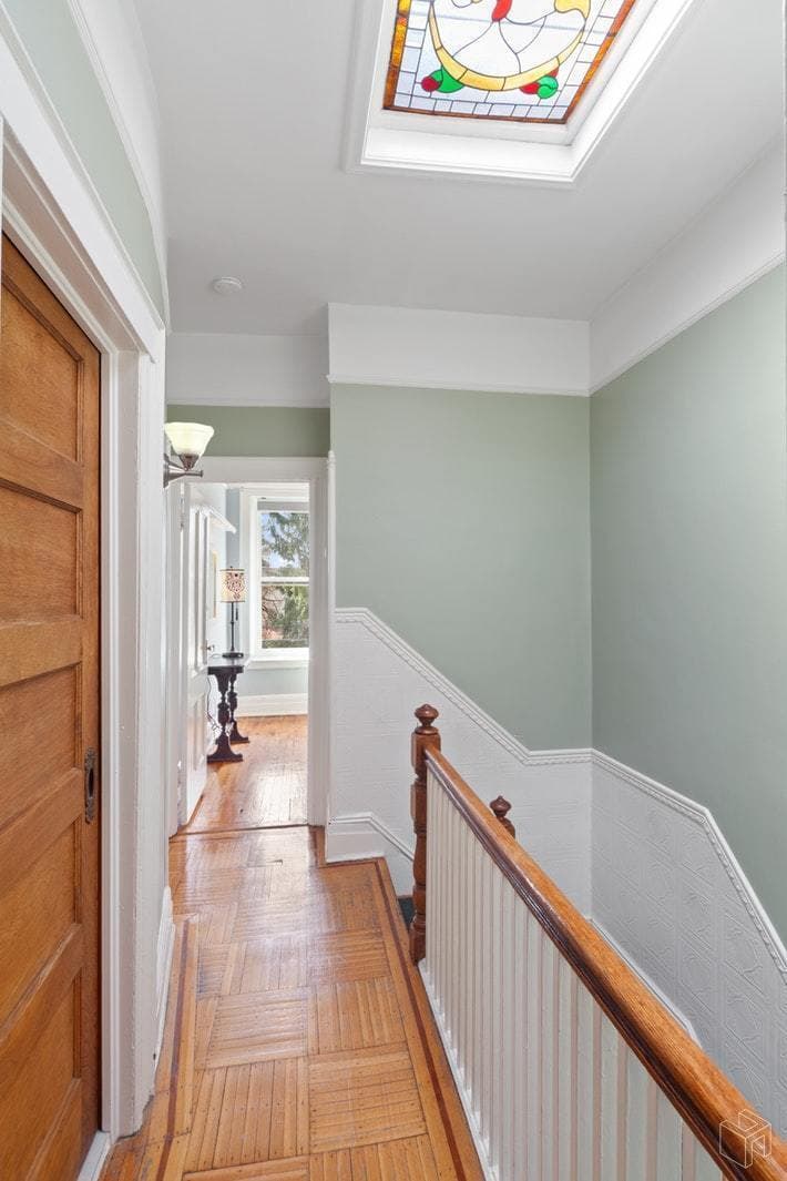 It looks to be in great shape, and many of the original features and details remain. Those include 10-foot ceilings, parquet floors with inlay designs, and stained glass skylights.