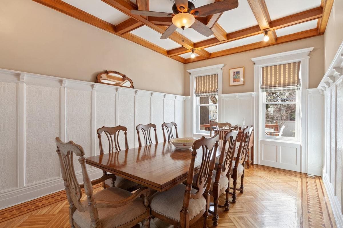The living room has bay windows, exposed brick, and a custom decorative fireplace. The dining room has a coffered ceiling, Lincrusta inlay wainscoting, and built-in cabinetry.