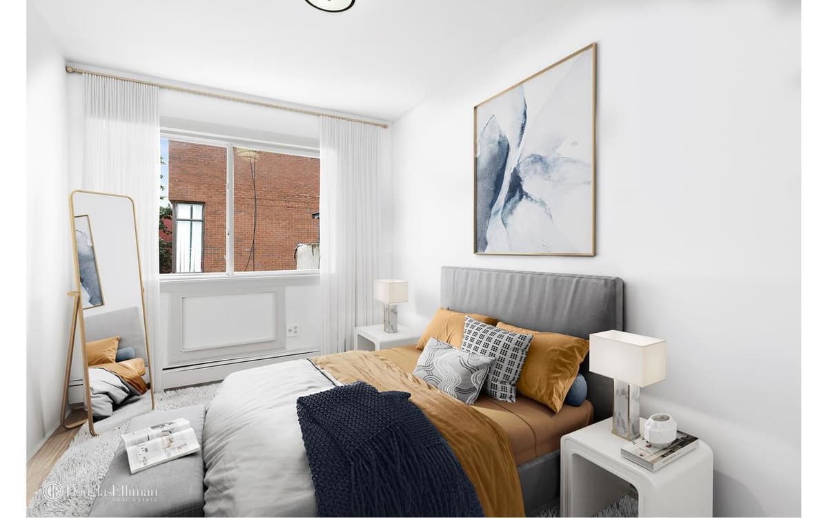 The owner's duplex is a five-bedroom, two-bath apartment on the upper two floors. The kitchen is open to a large living and dining area, which is well-lit thanks to large windows.