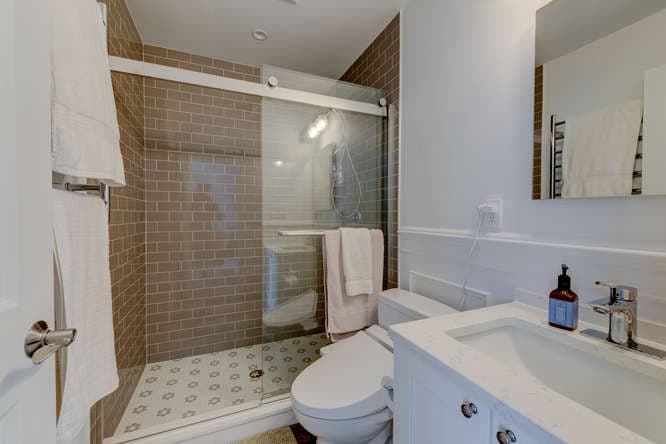 A bathroom has a large shower stall and looks recently updated.