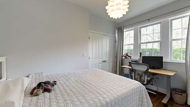 The bedroom is a nice size and has several windows.