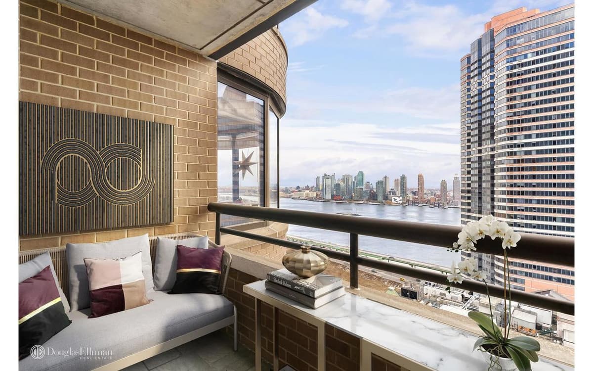 Apartment #24NO has south- and east-facing views. The living room has a wall of 18 large windows overlooking the East River.