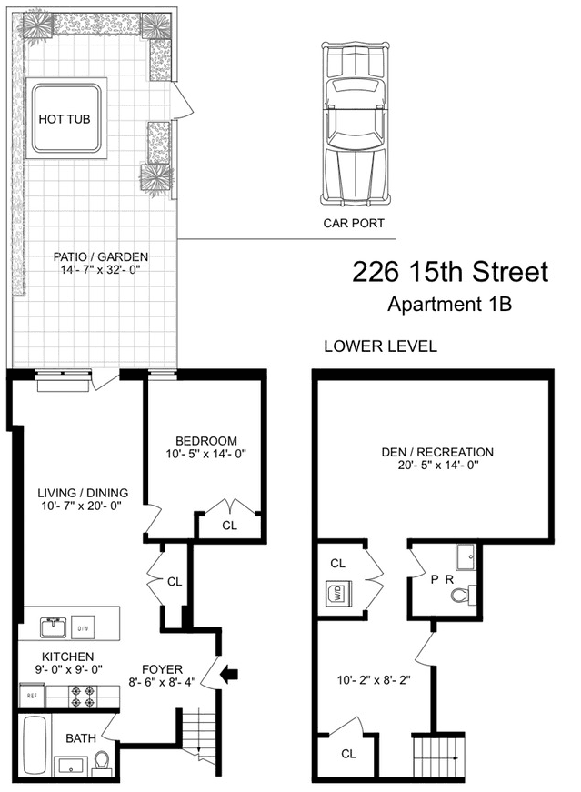 Listing pictures of the sunny yard and kitchen/living room at 226 15th St., #1B make this ground floor one bedroom in Brooklyn look pretty appealing. A wall of glass at the far end of the living room gives the impression of French doors, even though it is a combination of a door plus windows that reach the ceiling. Regardless, the room appears to get plenty of daylight and the paved patio stretches the living space, even if you only really put it to use in the summer.