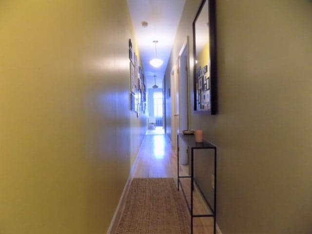 The bathroom has a full tub and a window. The other two bedrooms have north and south exposures.