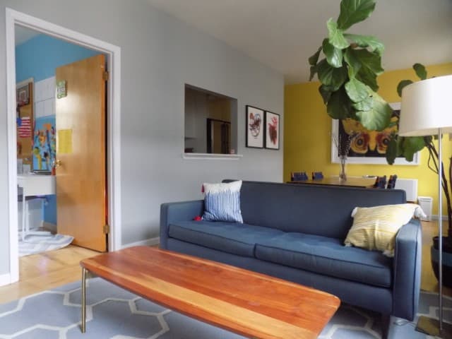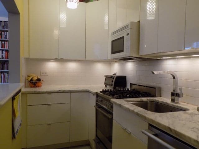 The galley kitchen has stainless steel appliances, marble countertops, a dishwasher and lots of cabinet space. There is also a pass-through window to the living room.