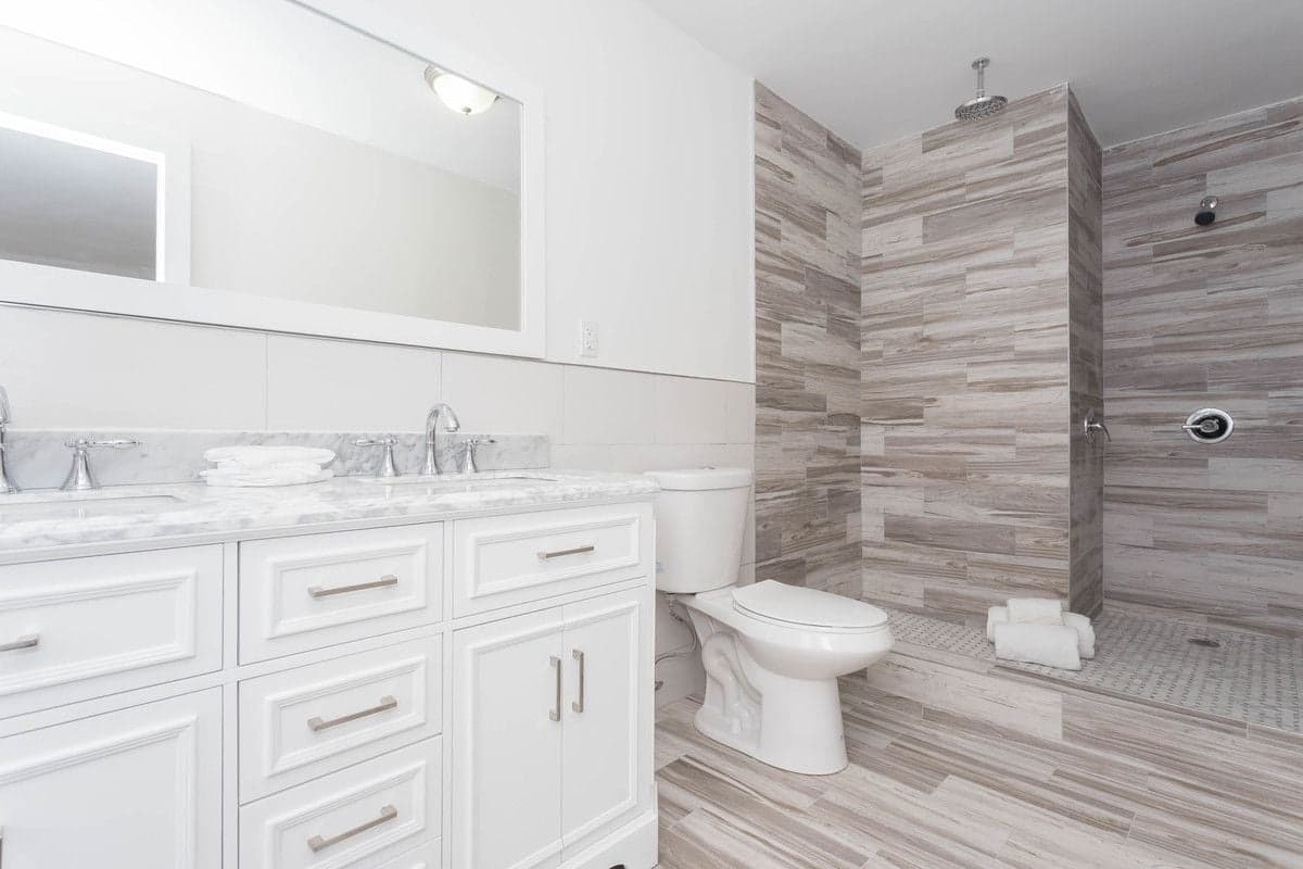 This bathroom looks nicely renovated, and appears to have two shower options, rainfall and standard.