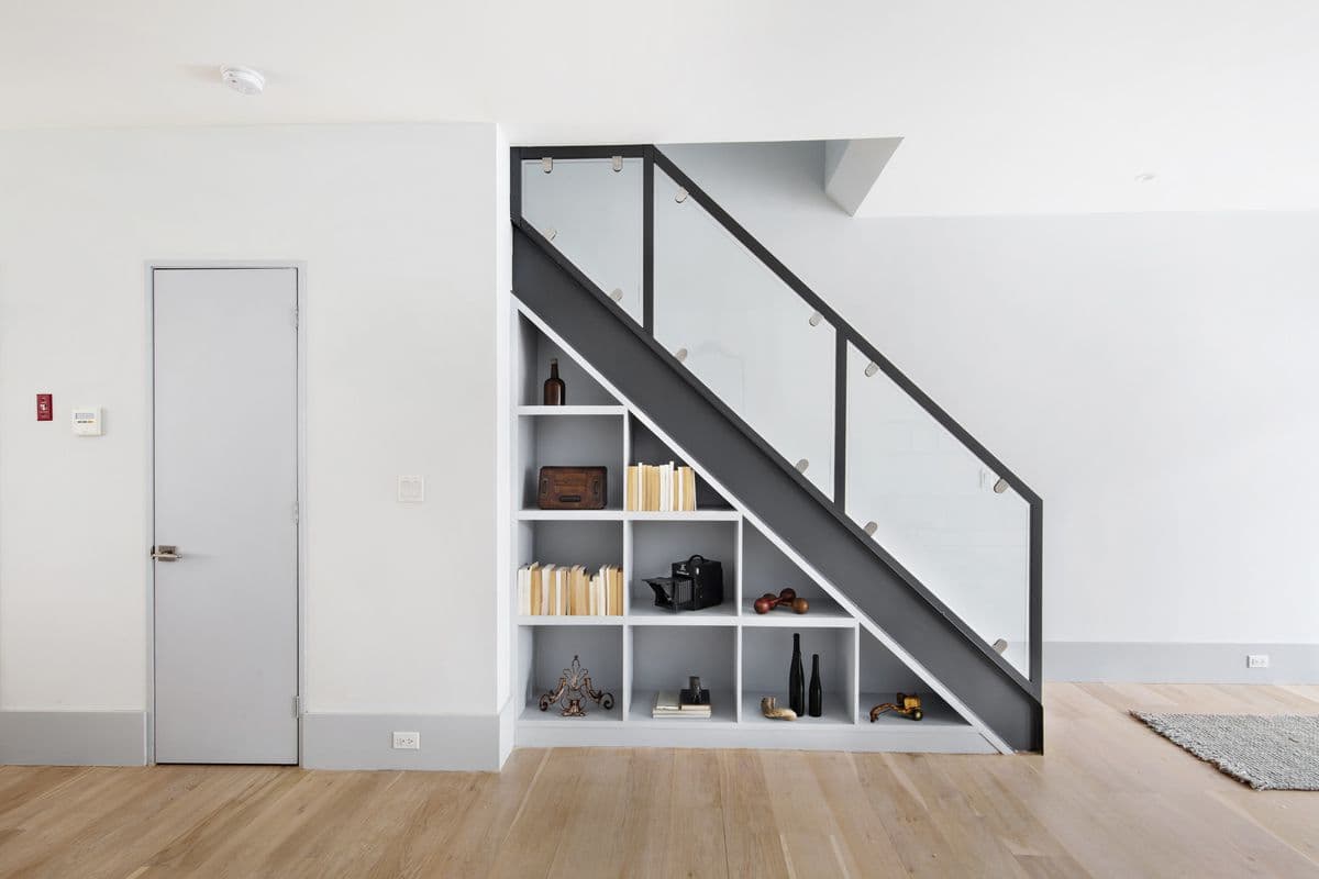 There is storage space under the stairs, as well as a powder room.