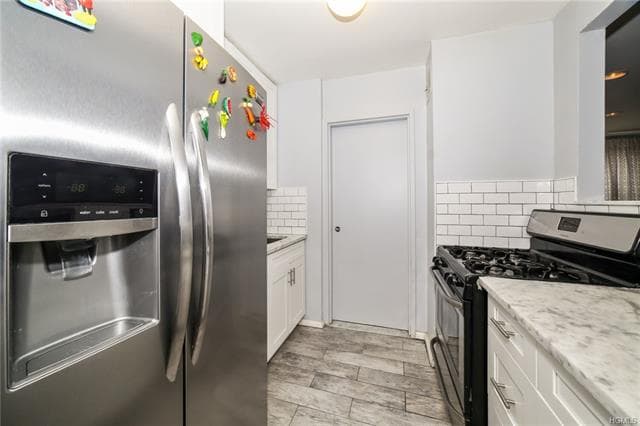 The kitchen is renovated and has stainless steel appliances and white subway tile.