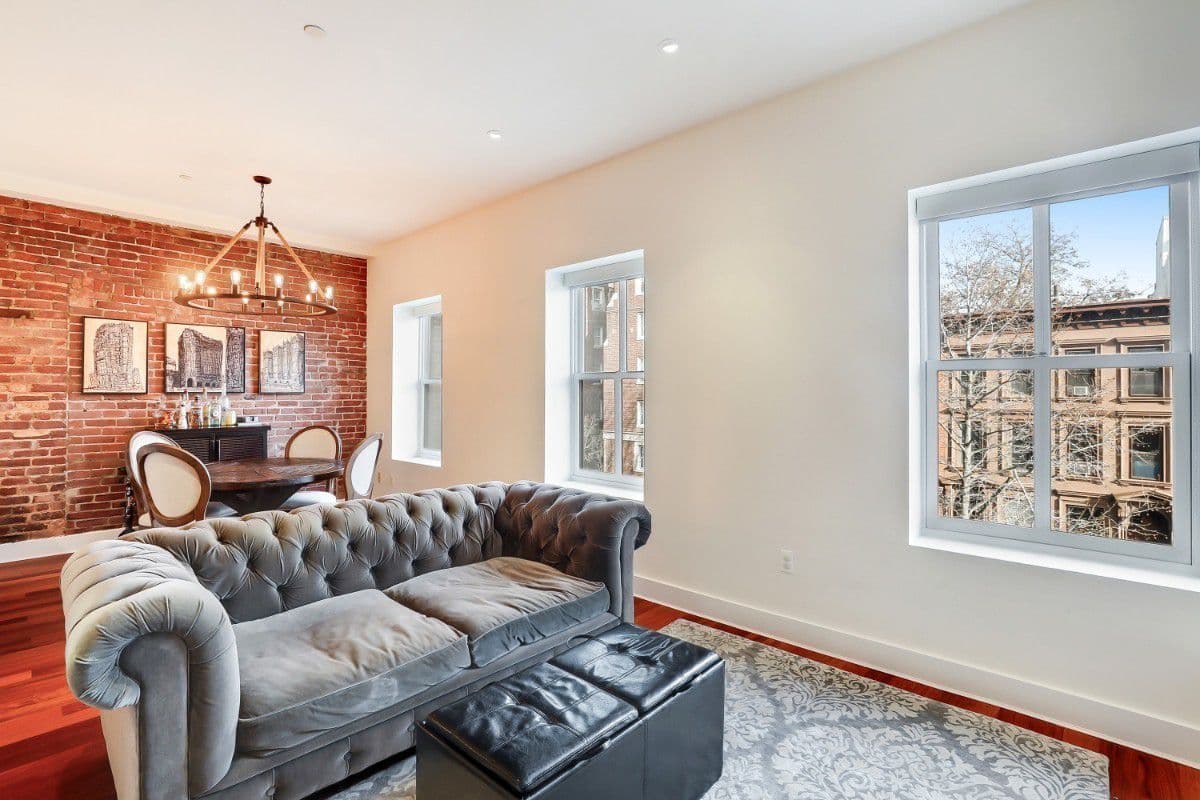 This 1,318-square-foot duplex, 264 Cumberland St., #12, is in a landmarked building connected to a neo-gothic church in Fort Greene. The unit isn't within the footprint of the former church so there are no arched windows or stained glass, but it does have a living room with three large windows stretched across the facade of the building.