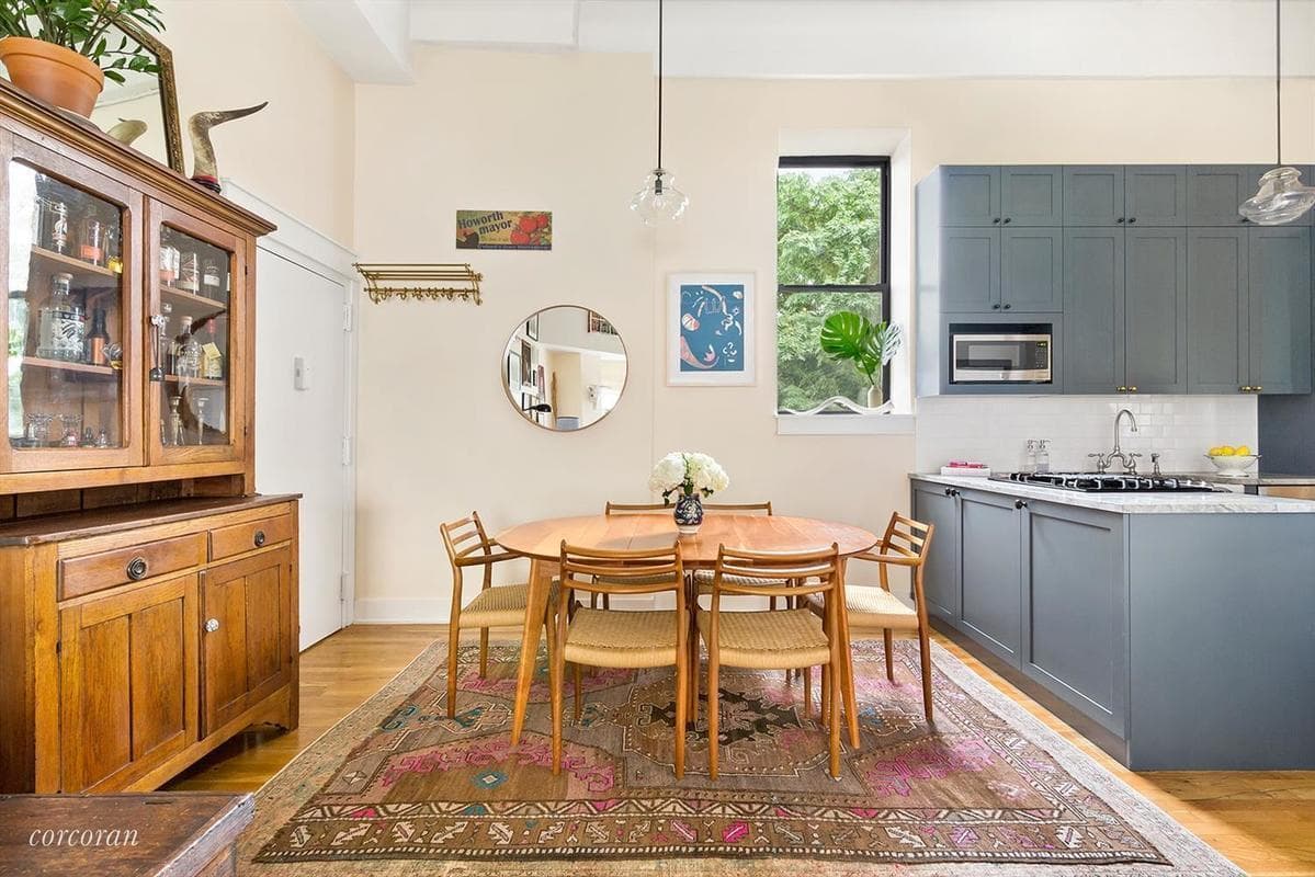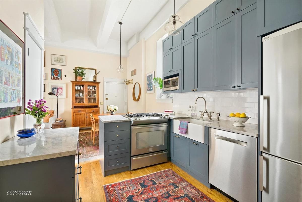 The chef’s kitchen has been gut renovated and features custom cabinetry, stainless steel appliances, a farmhouse sink, and white quartzite counters. It also has a mobile island.