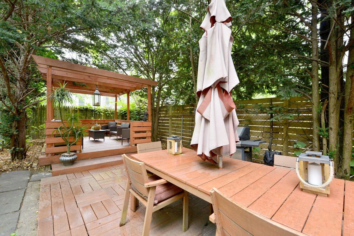 A door in the kitchen leads to the lovely backyard, landscaped with tall trees, a patio area and large pergola with seating. There's a full bath on this level as well.