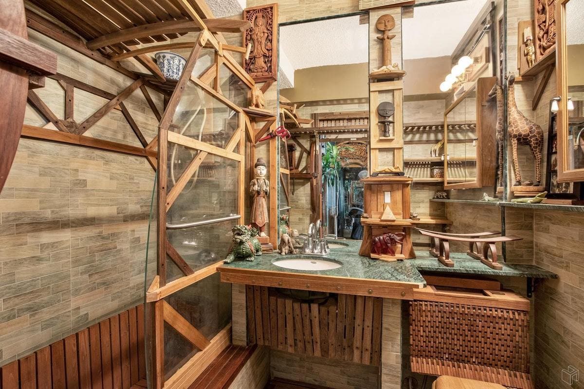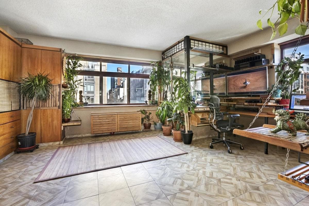 This apartment has been customized to the hilt, with imported teak throughout, and a Murphy bed to maximize the space. A corner unit, it gets northern and eastern exposure through its large windows—clearly a good situation for growing a lot of house plants, which are so necessary to complete the tropical theme.