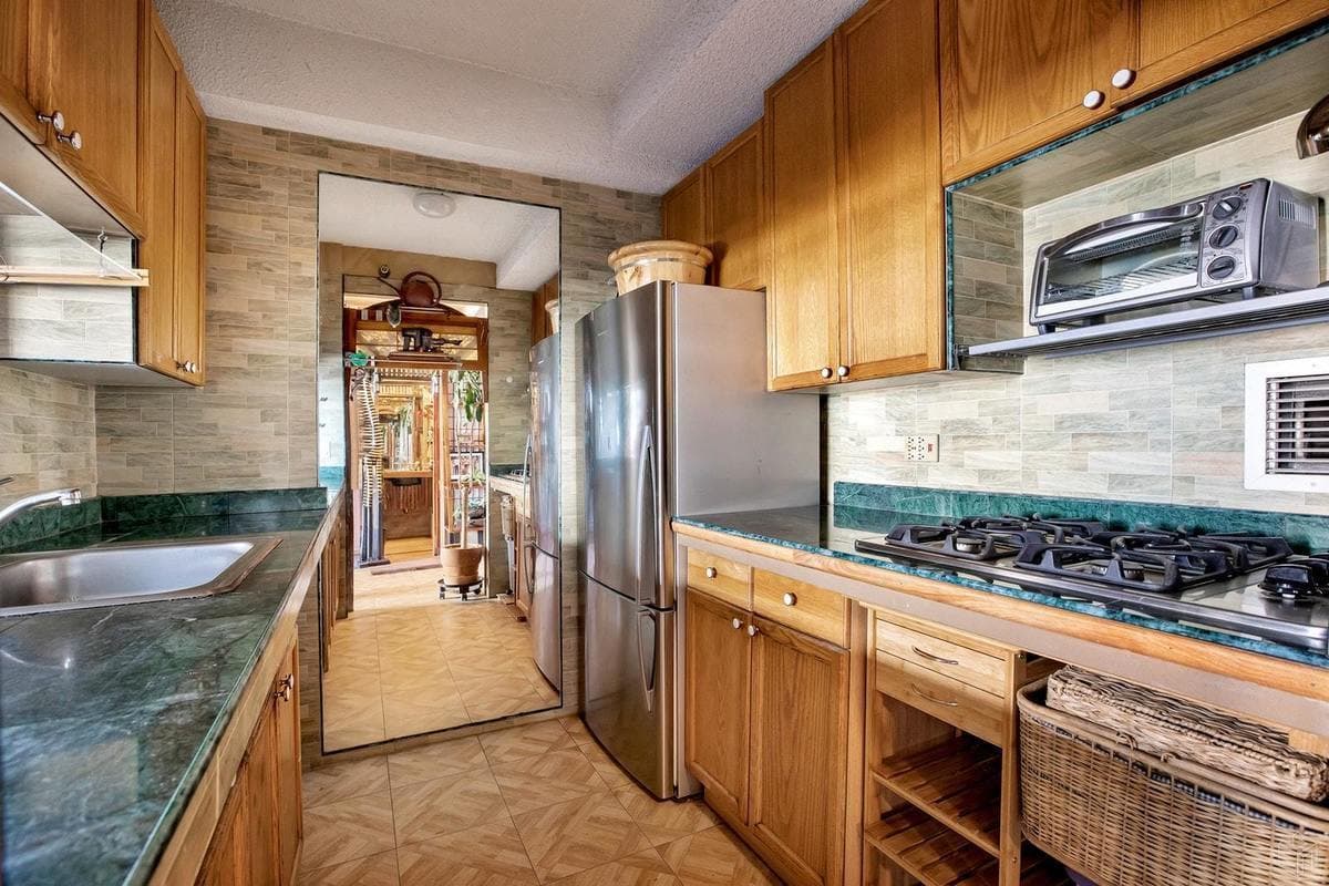 The pass-through kitchen features stainless steel appliances, green marble countertops, and imported tile.