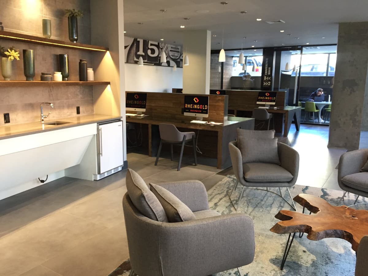 Small, soundproof conference rooms are located in the back, a casual seating area is in the front of the space, and there's a kitchenette area with a sink and mini fridge. Bathrooms are located just outside the main co-working space, and vending machines are nearby as well if you need a snack. (There's a coffee shop one floor up near the lobby if you need some caffeine.) In addition to this main co-working area, The Rheingold features nooks and rooms with whiteboards throughout the development so you can find a spot to work no matter your need or style.