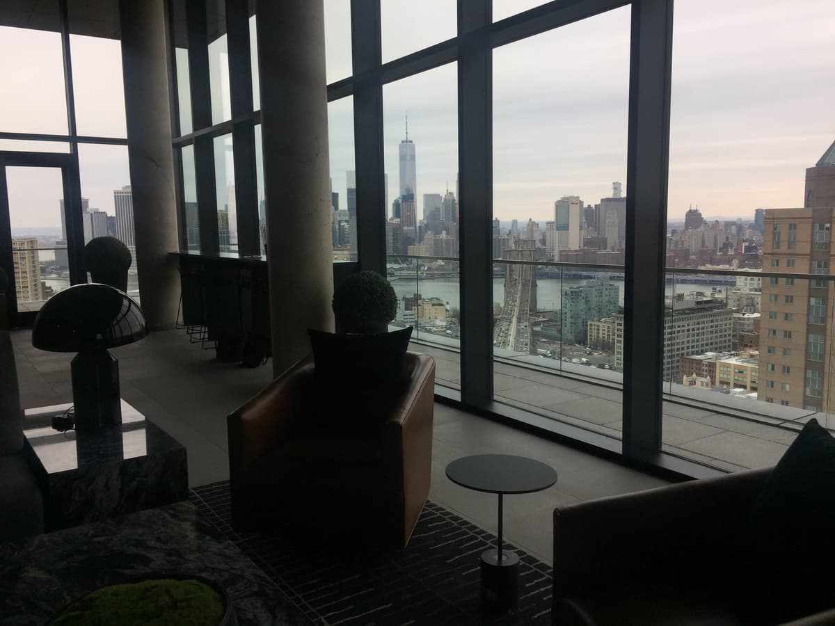 Co-working space: The Amberly's co-working space is the least traditional of the areas we tried out. (As with all the buildings we test-drove, you can technically co-work anywhere, like the 24-hour lobby with casual seating areas, or ninth-floor lounge.) But why work anywhere else when you can plug in at The Overlook and enjoy some of the most stunning views of Downtown and Midtown Manhattan, the East River, and more. We dropped in around 10 a.m. on a weekday and watched the city's late-morning churn: cars streaming over the Brooklyn and Manhattan Bridges, water taxis and boats cruising along, helicopters ferrying their presumably VIP occupants. Wow. Just, wow.