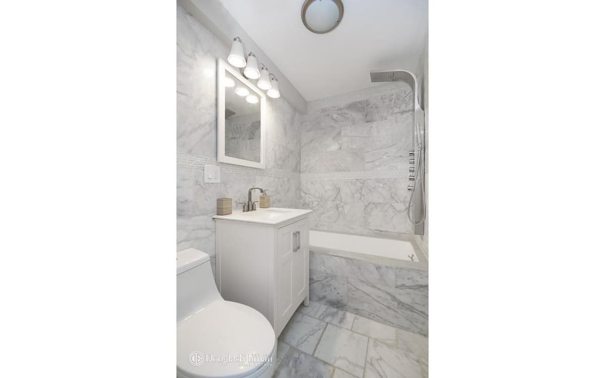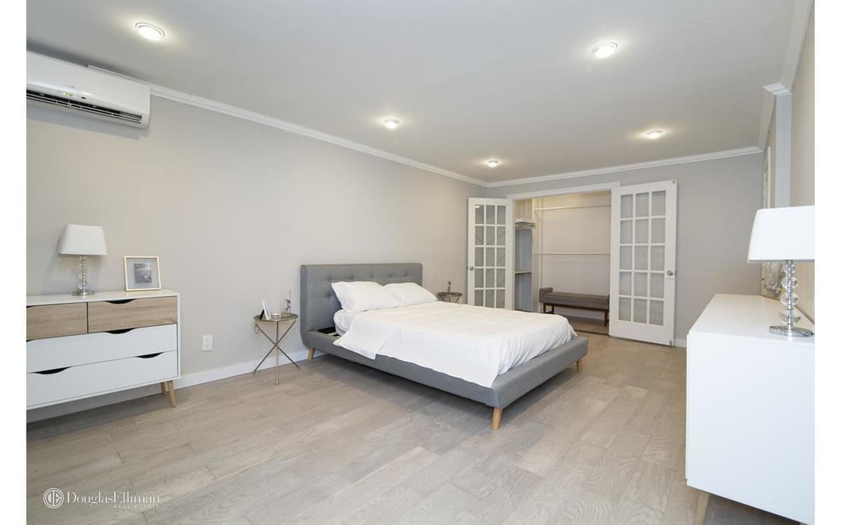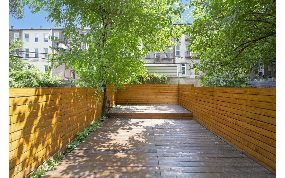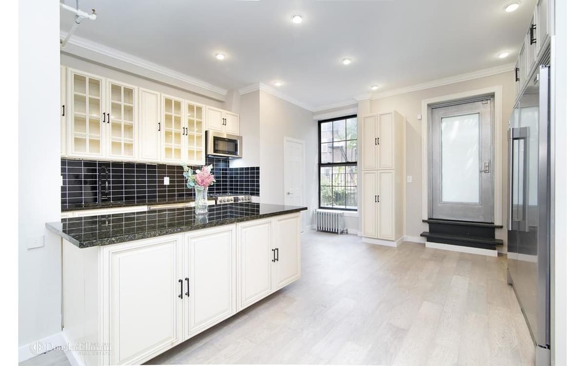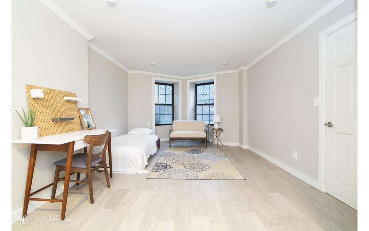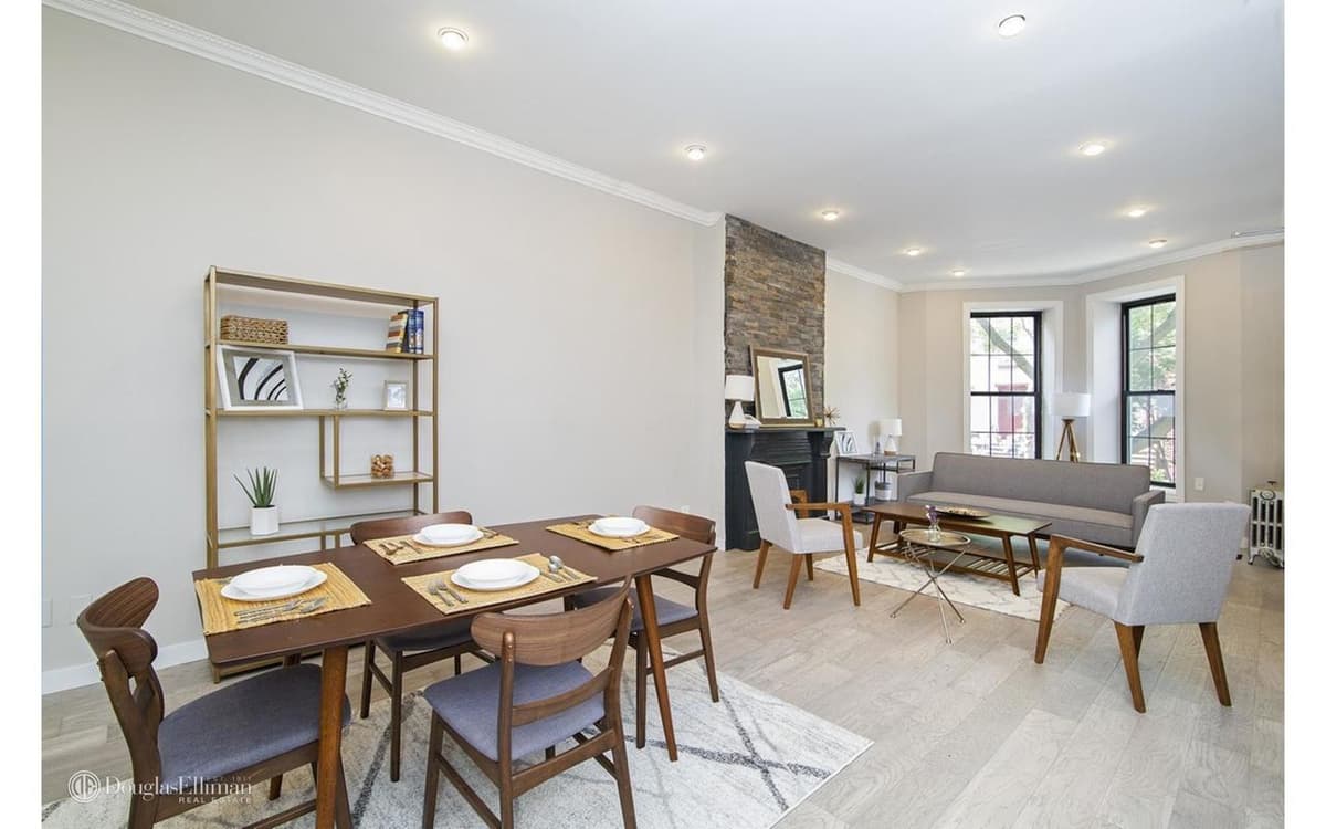 The owner’s duplex is located on the garden and parlor floors, and has two bedrooms and two-and-a-half bathrooms. It features an open-concept living room and dining area, high ceilings, new floors, and a decorative fireplace.