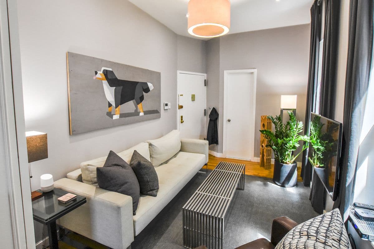 As you review the following photos, keep this in mind, too: All the furniture and decor throughout the apartment is for sale. (That's a pretty sweet wall of typewriters in the bedroom.)