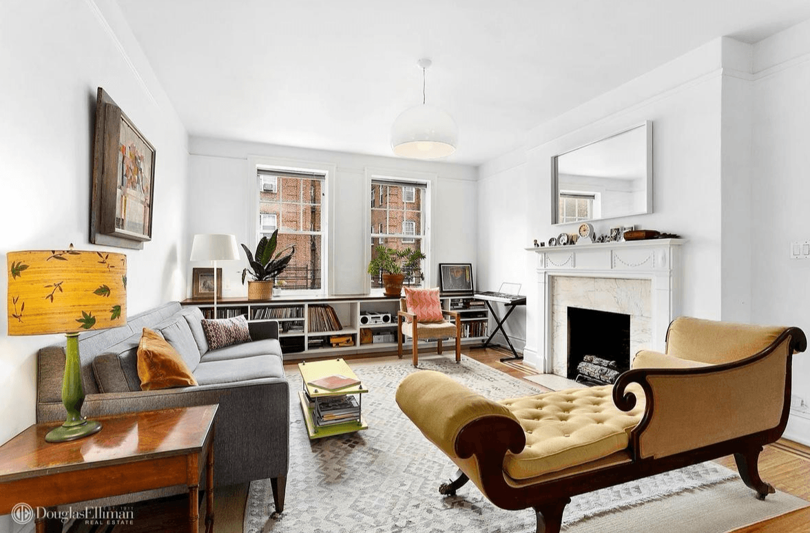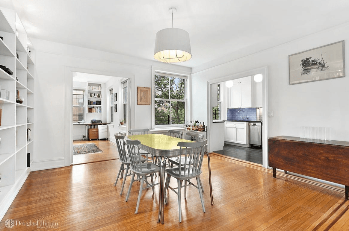 With an elevator that opens directly into the apartment, the co-op also has nine-foot ceilings, large windows, east and west exposures, and walnut and oak hardwood floors. There's also a wood-burning fireplace, extensive built-in bookcases and a separate, formal dining area.