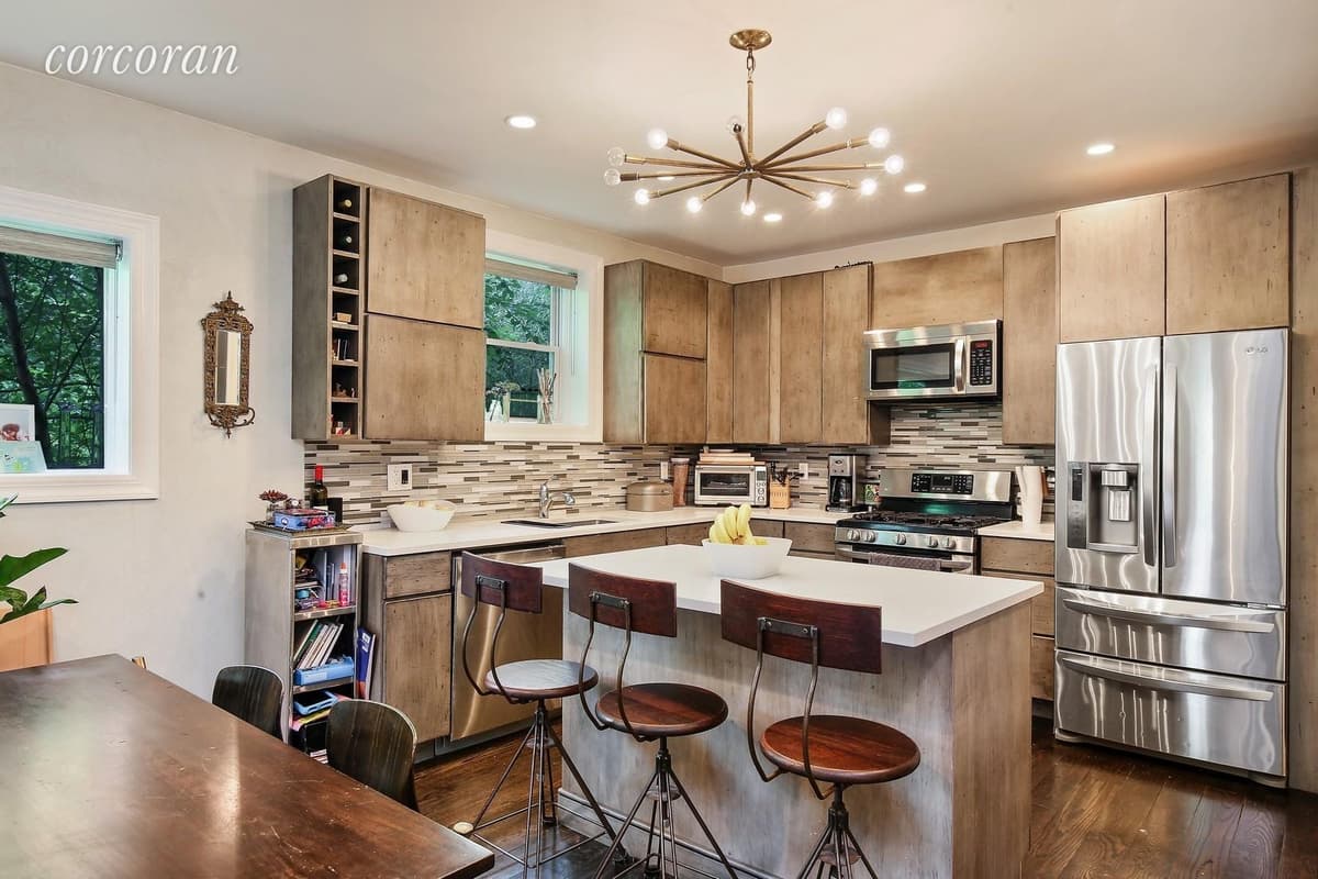 The renovated kitchen has weathered oak cabinets, an island, LG stainless steel appliances, and Caesarstone countertops. A powder room adds some flair with Flavor Paper-covered walls.