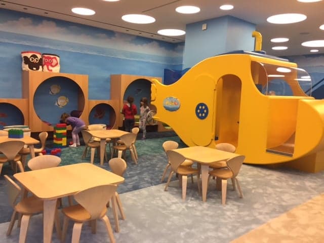 Kids' Take: The kids were definitely impressed. The "yellow submarine" play structure, with a lookout perch and slide was a hit, as was an "oyster" play area, complete with silver-hued oversized ball acting as a "pearl." (The Easton gets high points for its execution of the oceanic theme; even the elements for younger kids, like the illuminated and bubbling, touch-activated tubes and bead mazes, were sea-inspired.) Also engaging: a wall of cubbies, or reading nooks the kids immediately gravitated to, and classic choices like oversized soft LEGOS. It's probably not a surprise that the arcade-style video games were a huge hit, but foosball was very popular as well.