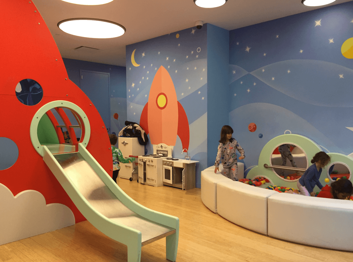 Also built in 2016, Tribeca's 456 Washington St., features a children’s playroom with a space exploration theme, anchored by an impressive, custom rocket ship play structure. There's also a mini ball pit, play kitchen (with shopping cart), wall-mounted puzzles and bead mazes for little ones, a nook stocked with a variety of toys and games, a tiny basketball hoop, and a mini electric BMW convertible.
