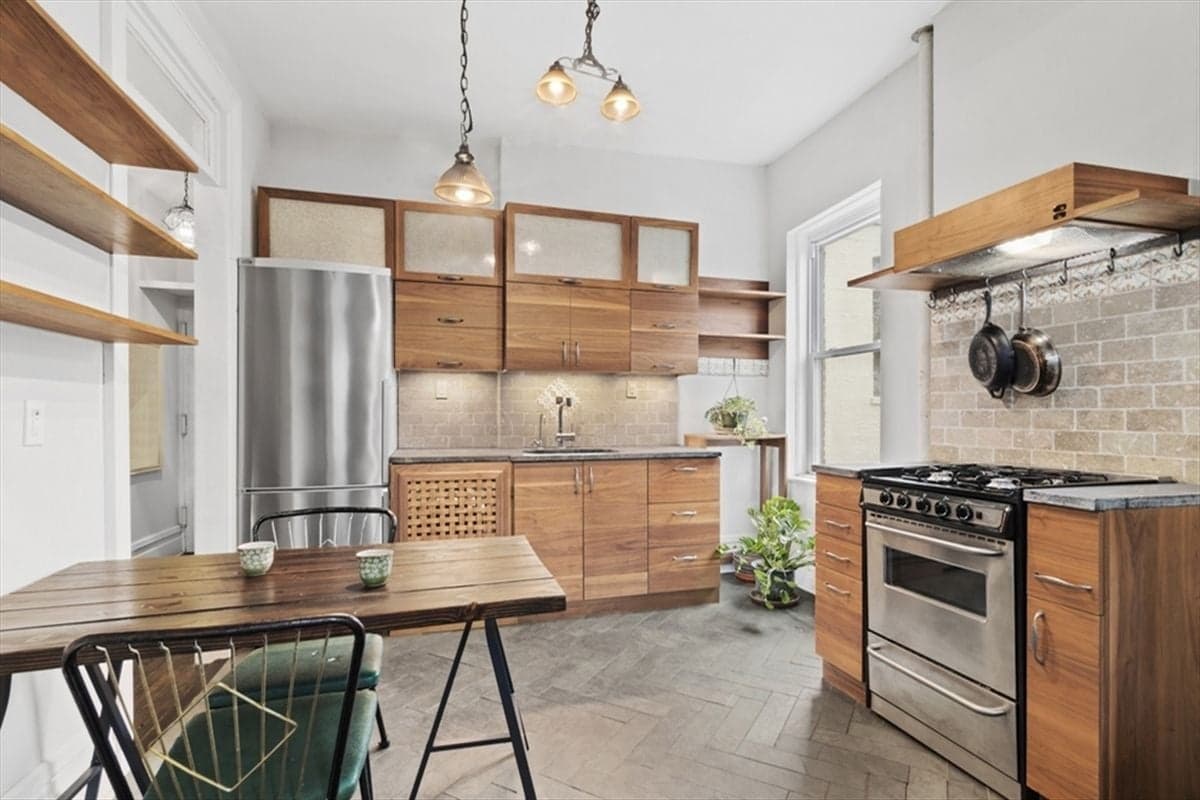 The eat-in kitchen has salvaged walnut cabinetry, soapstone countertops, hand-painted tile, a dishwasher, and slate herringbone floors.