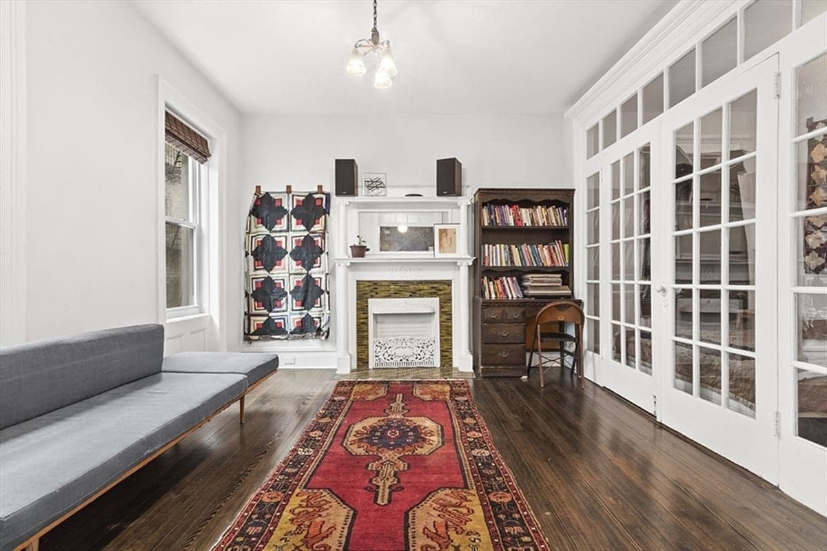 The listing describes it as "gut restored," updating the bad, and keeping the good. Historic features include a decorative mantle, transom windows, and original wood floors. The living room is open to the kitchen and includes custom pieces such as light fixtures and window gates by local artist Linus Caraggio.