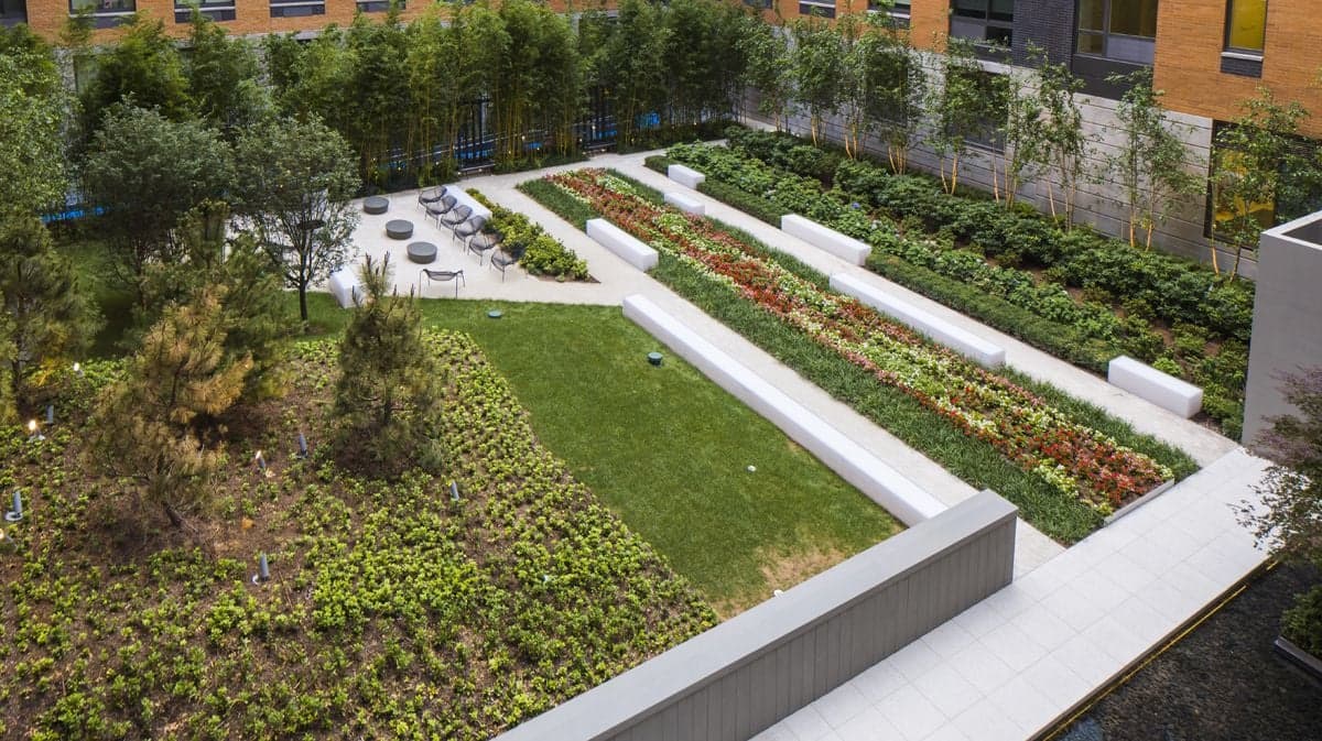 The attention to detail starts inside the apartments. Homes at Gotham West feature full-size stainless-steel KitchenAid appliances, hardwood floors, oversized windows with city and river views, spacious bathrooms with large vanities, and individual heating and cooling units. The architectural details connect interior design choices with the modernist building and the landscaped outdoor areas.