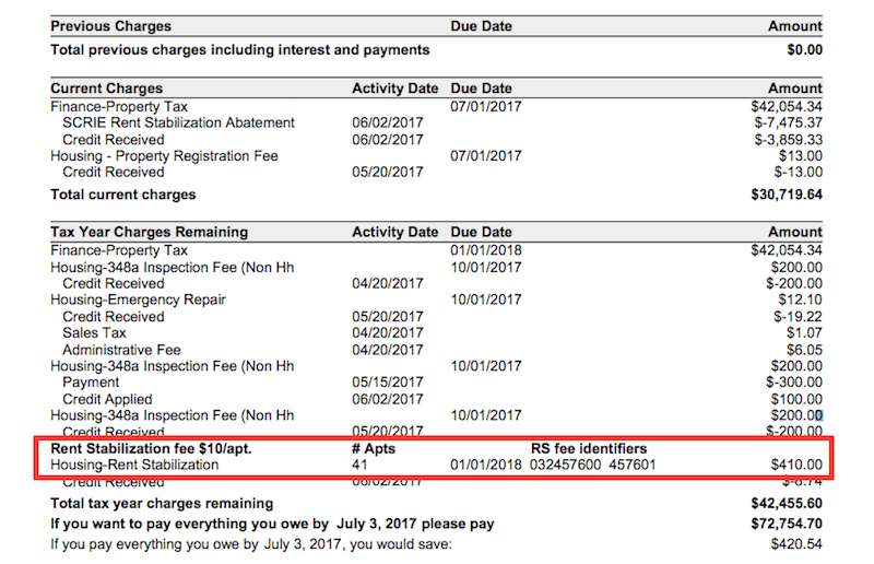 Another avenue of research is the building's tax records. DHCR is notoriously un-forthcoming about the stabilization status of apartments besides the one you live in, but landlords have to include certain relevant information on their tax forms each year. Specifically, if the building is subject to 421-a, J-51, or some other tax break program that comes with an affordability/regulation requirement, that will show up on the tax bill. Similarly, building owners have to pay a surcharge of $10 per rent-stabilized apartment, and that too is reflected on the bill, like in the example below.